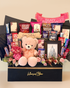 A lavish selection crafted to delight every mood and craving. It features KitKat (4-finger ×3, 2-finger ×1), Biscottò wafers, Loacker wafer, Bounty (2), Snickers (2), Cadbury Dairy Milk (38g ×2, 90g ×2), Mars, Innovative Haven cookies, Macho chips (2), Choco Loco popcorn, Danisa cookies, Day Dream cookies, Frisky wafer, Bear gummies, artificial flowers and a photo frame.